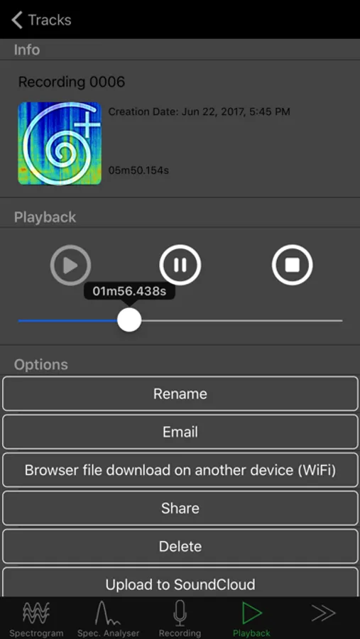 · Live Spectrogram and Spectrum Analyser Views of Recorded Files. Files recorded can be played back and the Spectrogram and Spectrum Analyser modes can be used to review the audio.