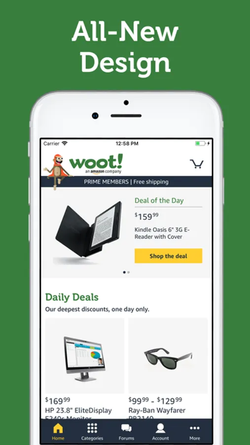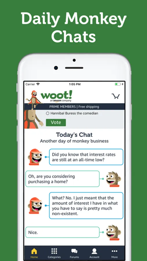 We’re the original daily deals site, with crazy low prices on stuff you need and stuff you didn't even know you needed. Shop hundreds of deals on electronics, home and kitchen goods, sports and outdoor gear, original t-shirts and tons more. There’s something new every day on the Woot! app, with fresh sales, exclusive app deals, polls, and daily monkey chats from our mascots, Mortimer and Monte. Plus Amazon Prime members get free standard shipping on Woot!