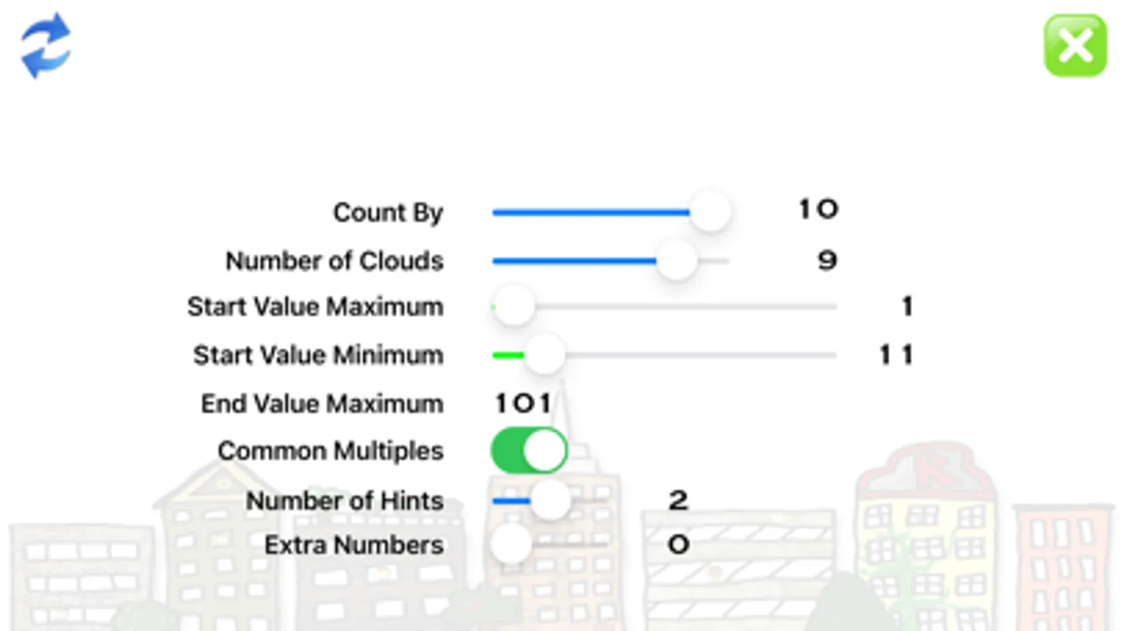This game helps provide skip counting practice for 1s, 2s, 3s, all the way up to the 10s. There is built in flexibility within the game to meet your child/student’s needs. You can select the number to count by, the amount of tiles in the number sequence, the minimum and maximum start value as well the number of hints. For an extra added challenge, you can also choose whether you would like to count by common multiples or uncommon multiples.