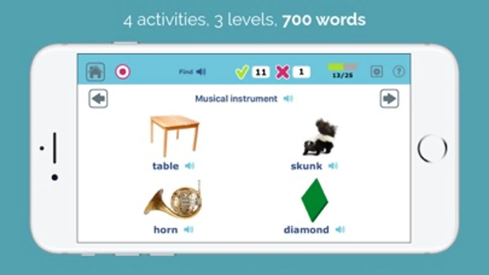 • 3 difficulty levels ranging from simple objects to more abstract concepts