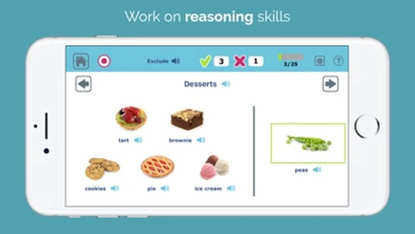 4) EXCLUDE: Challenge yourself. By choosing an item that doesn't belong, you learn how to independently identify categories. As things get harder, you can always tap Hint for some help.