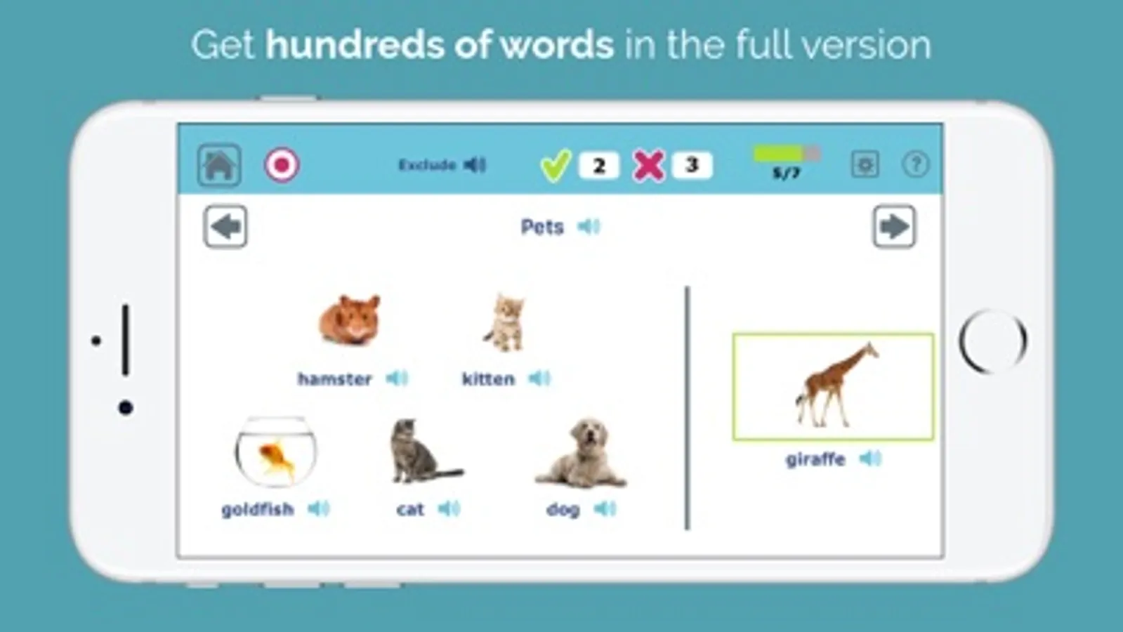 4) EXCLUDE: Challenge yourself. By choosing an item that doesn't belong, you learn how to independently identify categories. As things get harder, you can always tap Hint for some help.