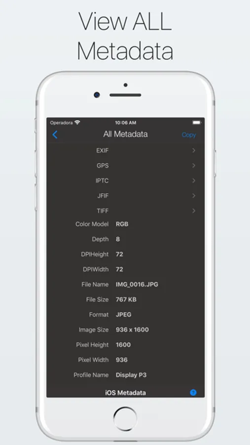 Photo and video data may include location (if enabled by the camera), date, device, software versions, file size, file name, an "iOS Metadata" section, and many more metadata items. more.