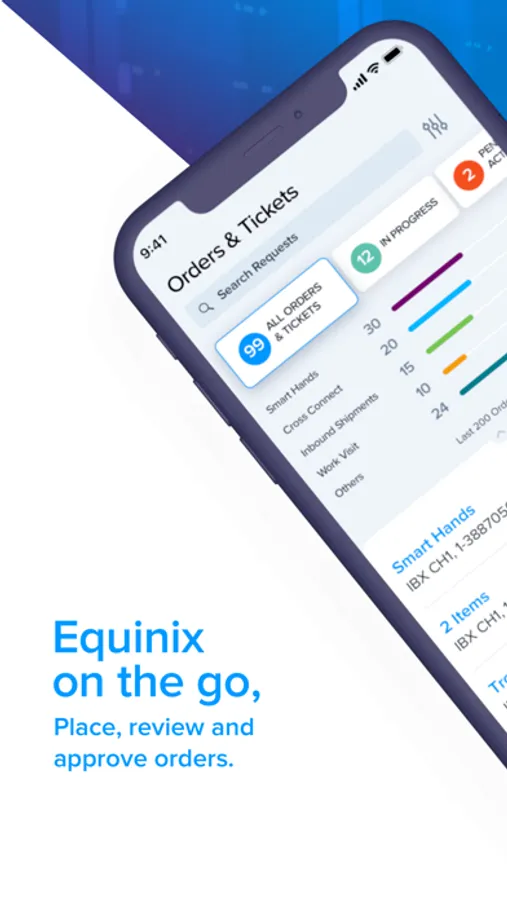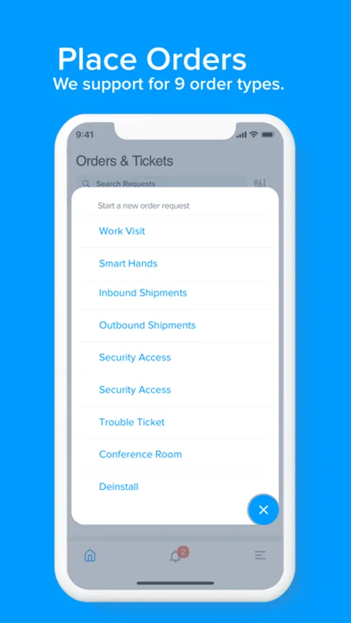 • Place orders for Smart Hands, Work Visit, Inbound Shipment, Outbound Shipment, Trouble Ticket, Security Access & Conference Room Booking