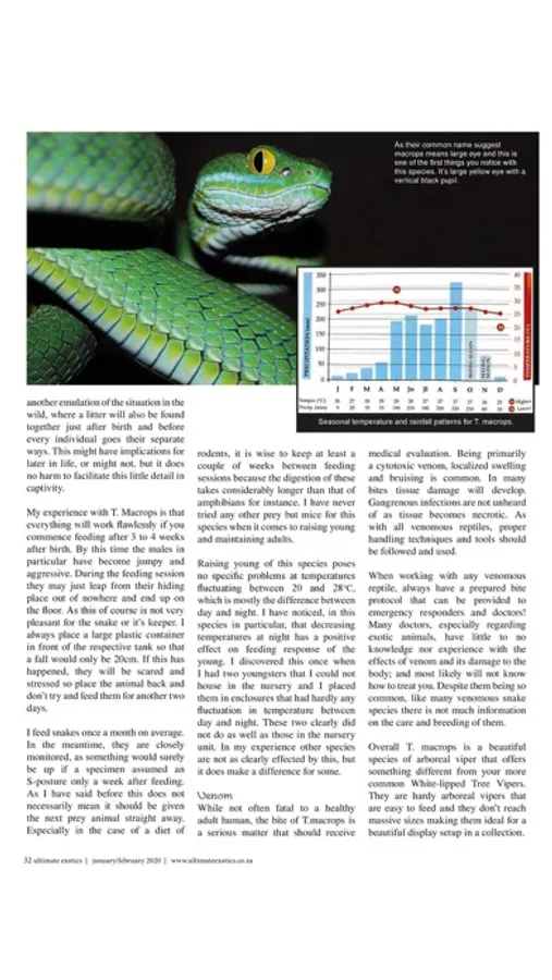 Ultimate Exotics is the ultimate reptile and exotic pet magazine! The Ultimate Exotics magazine contains up-to-date articles on the keeping and breeding of reptiles, amphibians, arachnids and insects in captivity! Articles in Ultimate Exotics are written by experienced keepers and breeders who share their valuable experience, allowing readers the opportunity to have the same successful results with their animals.