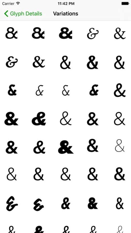 * View all the variations of a glyph in all fonts that support it.