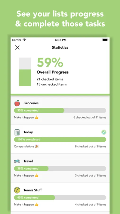 View the progress of all your lists combined, as well as each list individually. You have to check every last task to get that 100%!!!