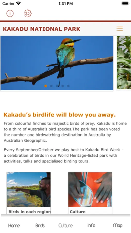 Take this app on your Kakadu National Parkadventure and meet around 50 of our favourite birds. See pictures, play bird calls and learn where to find them. Learn Aboriginal bird names and use our interactive map to explore the park, with details of campsites, hotels and suggested itineraries.