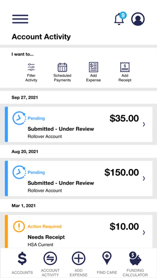 View all of your benefit account(s) recent transactions, balances, election information, claims filing deadlines, and more. You may also view transactions that require receipt documentation that may need to be submitted.