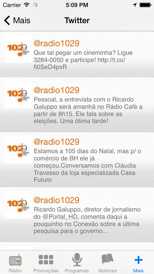 Há 4 anos no ar, a rádio 102,9 se tornou referência em música boa em Belo Horizonte. Com uma programação adulto contemporânea, explorando os grandes sucessos dos últimos 20 anos e os novos talentos da música. Com o aplicativo mobile, a nossa audiência poderá ouvir a programação ao vivo 24 horas por dia. As músicas mais pedidas, os programas feitos especialmente para você, com muito mais música, conteúdo e as últimas notícias da cidade e do mundo. Fique por dentro das promoções que rolam na rádio e tudo que acontece no twitter oficial da 102,9.