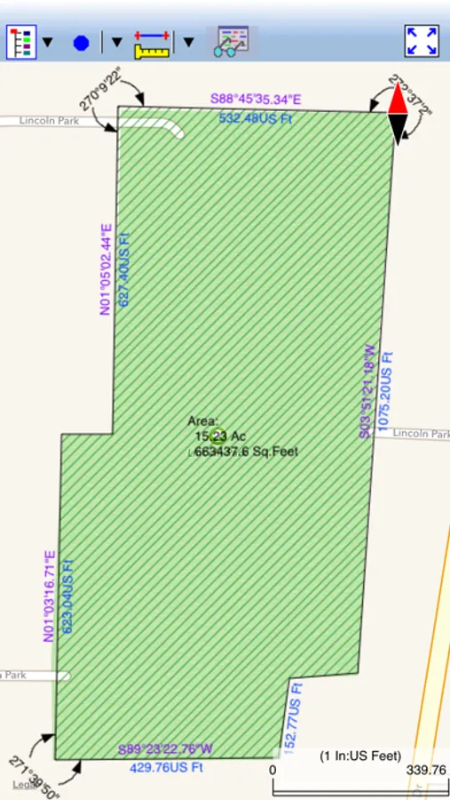 * Label the Areas with size in acres and square feet or hectares and square meters.