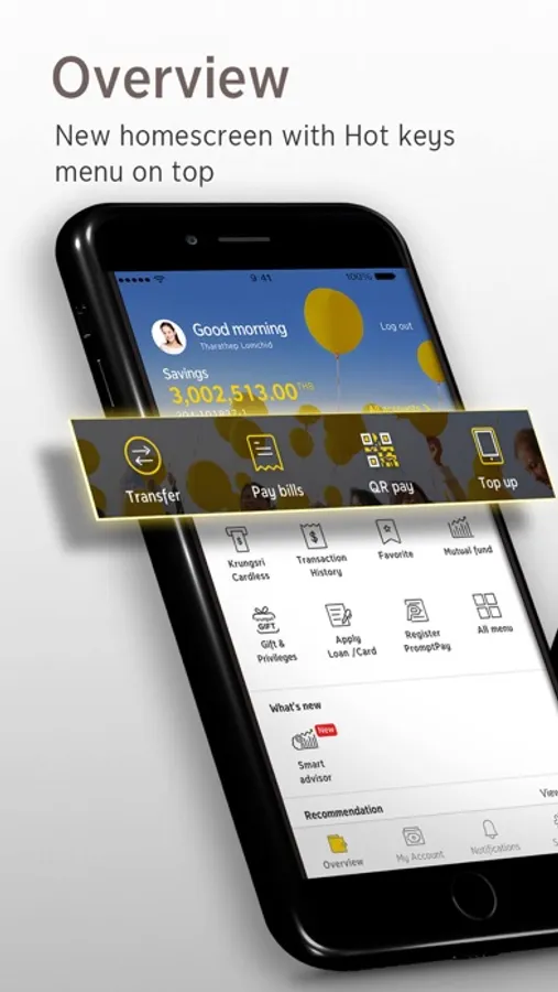 - Register at any Krungsri Branch to get Password then download Krungsri Mobile App and log on