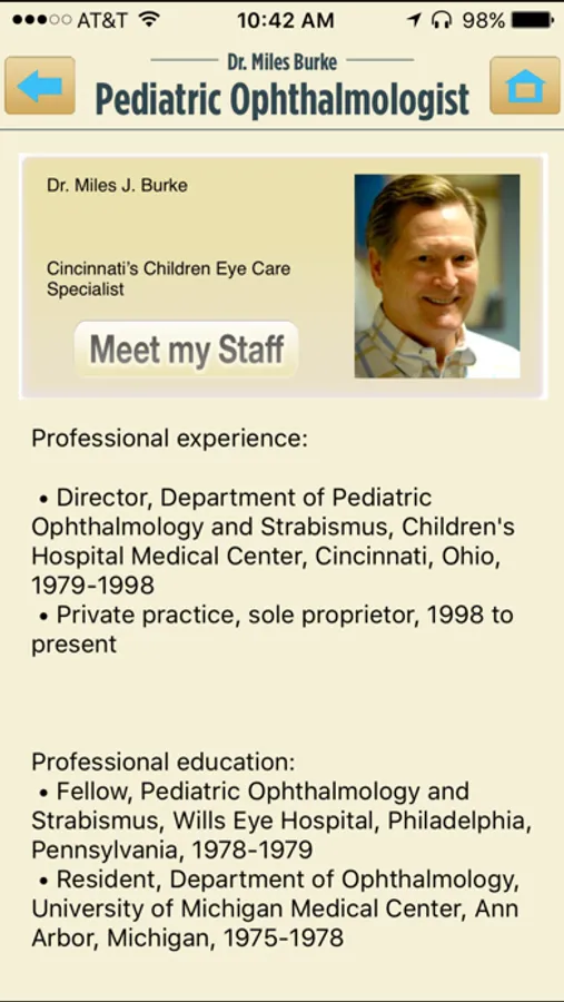 Dr. Miles Burke Pediatric Ophthalmology and Adult Strabismus is the premier app for eye doctors and patients! Dr. Burke has a been a leader in eye care for over 30 years! Educate your patients about Dr. Burke, his staff and procedures, appointments and more. Get directions to Dr. Burke's office using two taps within this free app. Click “…More” to learn why you should download this top Medical app today!