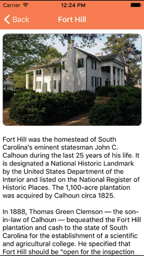 Clemson University Historic Properties is an interactive way to explore the rich history of the campus environs. Navigate a virtual tour of the historic house museums Fort Hill: Home of John C. Calhoun & Thomas G. Clemson and the Colonial Historic Hanover House illustrated by photographs, video and period music. Learn about National Register sites such as Hopewell: Home of General Andrew Pickens and the Revolutionary War sites nearby including the Battle of Seneca Town, Fort Rutledge, and the Hopewell Treaty Oak.