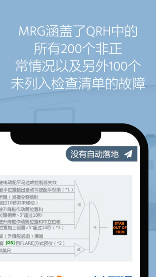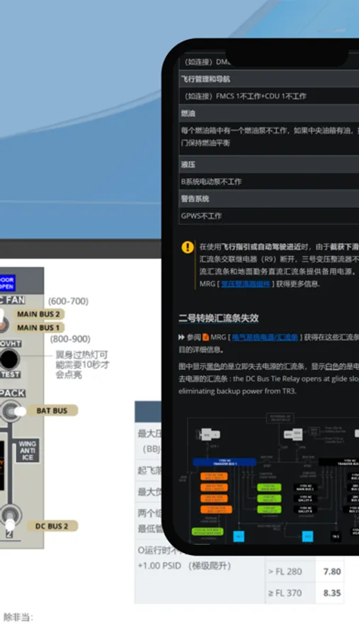 B737MRG涵盖了300多种不同的非正常情况, 比官方的快速检查单QRH多出100多种。本应用APP为每种非正常情况,不管是在地面还是在飞行中,都提供了系统注解和实际的处理建议。 本应用包含了超过2200幅示意图、逻辑门、灯和原理图。