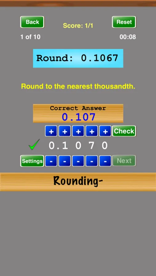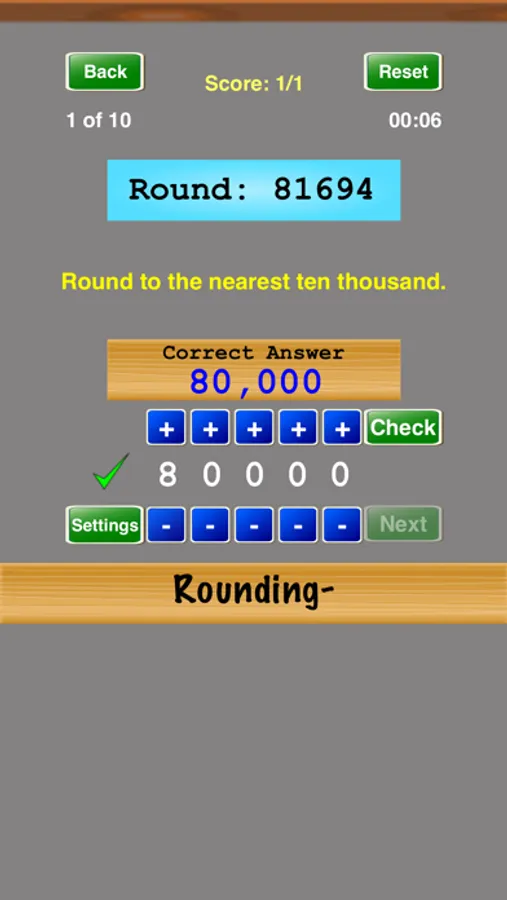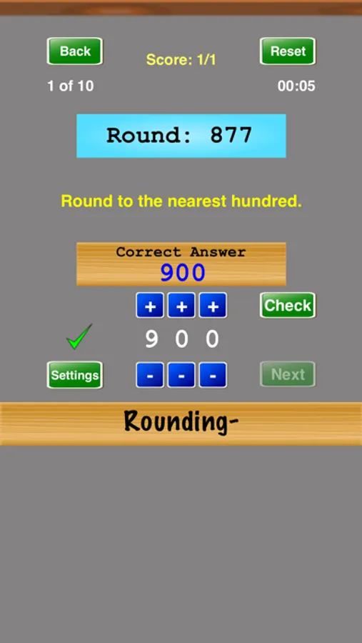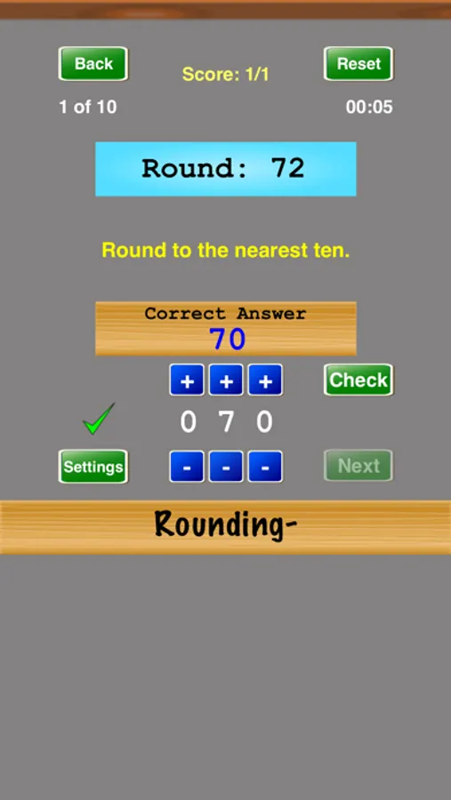 Rounding- is a great way to test your rounding skills and have fun at the same time. Select the number of problems and other options in the "Settings" screen. Play until you master the game.