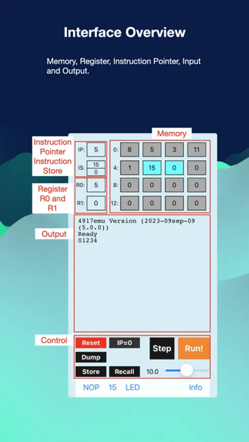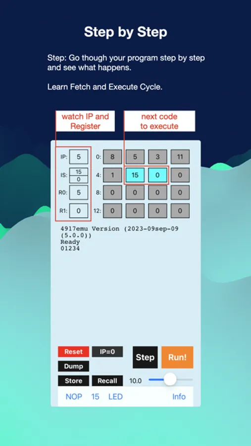 For example the following 4917 machine code program would print the numbers from zero to 15: 8 0 3 11 1 15 0.