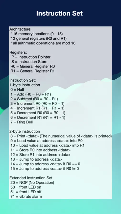 Each memory location can store a number between 0 and 15, and there are 16 instructions.
