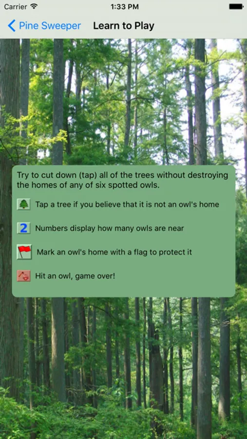 If you enjoy Minesweeper type games and nature, you will love this game. Each day millions of trees are cut down destroying the habitat of endangered species. The spotted owl is no different. In an effort to raise awareness of environmental issues such as this, PineSweeper was created to explore the dangers of deforestation.