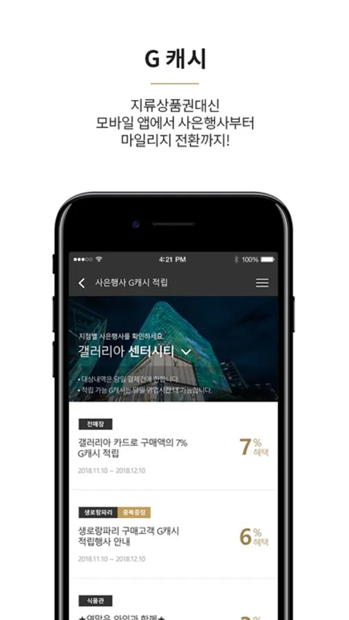 사은행사, 마일리지전환, 지류상품권 전환을 새로운 갤러리아의 모바일 캐시인 G캐시로 현금처럼 자유롭게 사용할 수 있습니다.