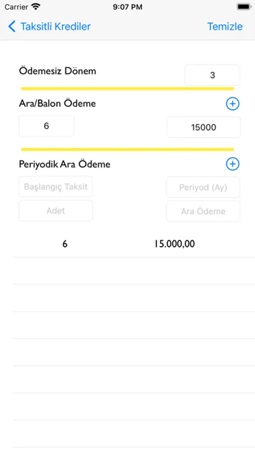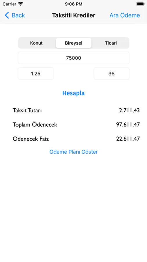 ARA/BALON ÖDEMELİ kredi hesaplayabilirsiniz. Ödemesiz dönemli kredi hesaplaması da yapabilirsiniz.