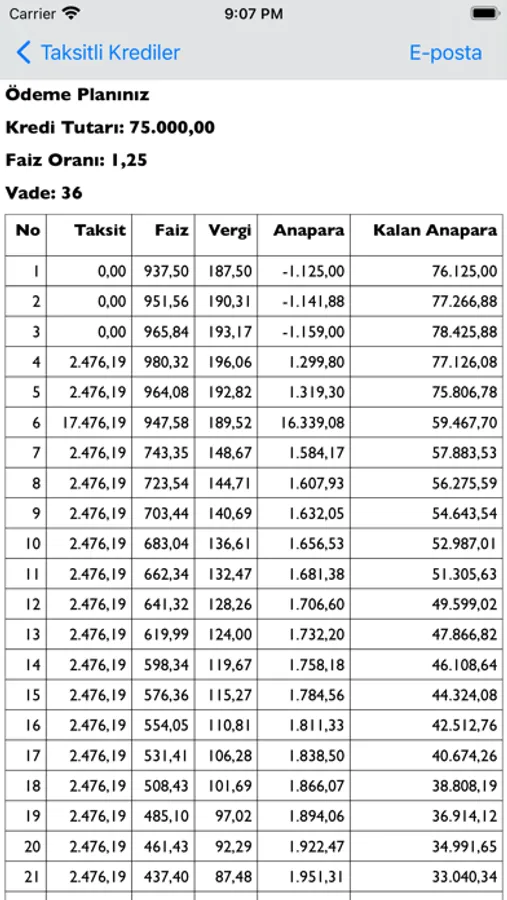 Taksitli Krediler için ödeme planı görüntüleyebilir ve e-posta ile gönderim yapabilirsiniz.