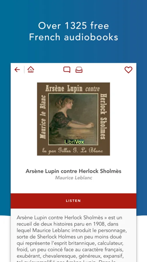 Ėcouter des livres en français! If you would like to improve your French listening and comprehension skills, download Livres Audio today to practice listening to native French speakers reading over 1325 classics, poems and short stories with accurate intonation and accents.