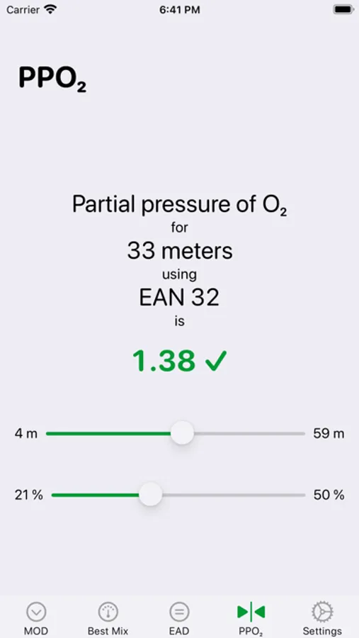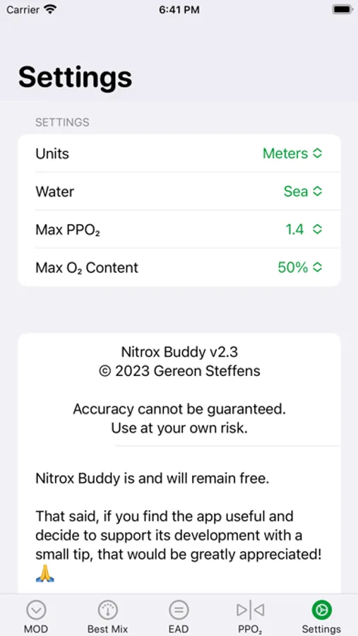 The app works with imperial or metric measurements, sea or fresh water, and allows you to select the maximum oxygen content and partial pressure.