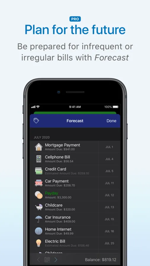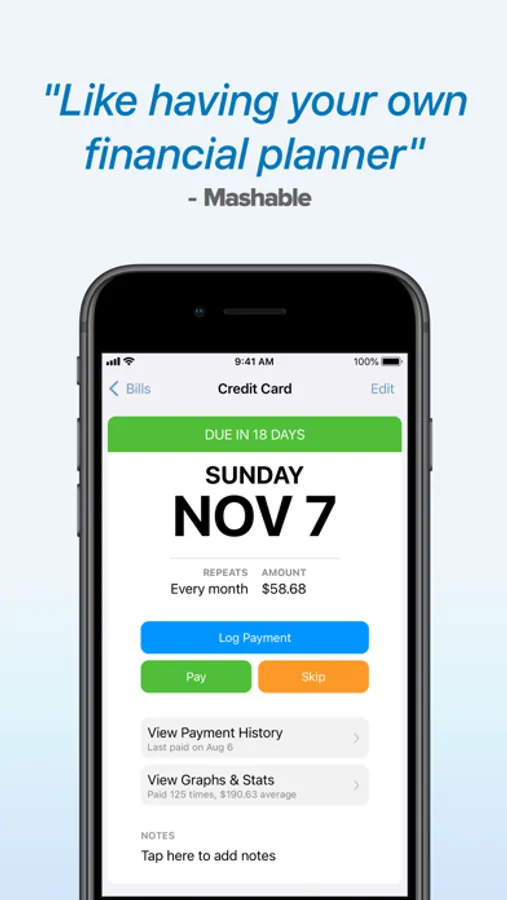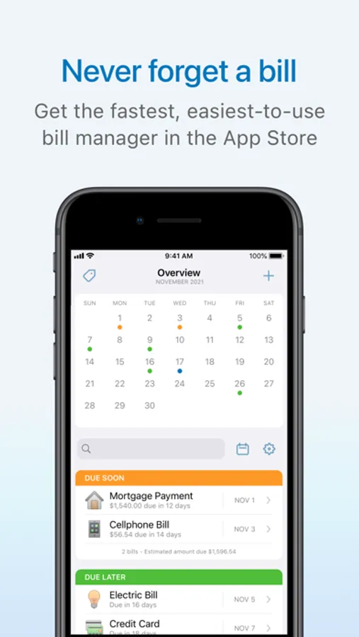 The easiest, fastest bill manager in the App Store. A universal app for iPhone & iPad, with multitasking on iPad. Cloud sync works across all iOS devices plus Mac with the available Mac version.