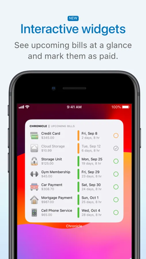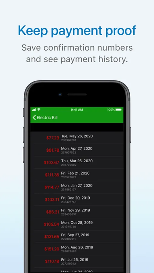 In addition to reminding you to pay your bills, Chronicle keeps track of all your payment history, including confirmation numbers, so you always have proof of payments.