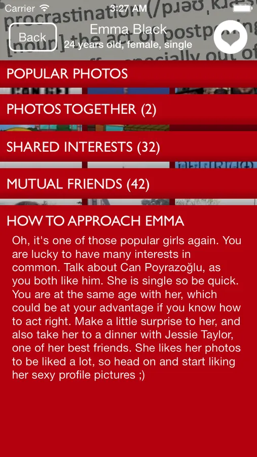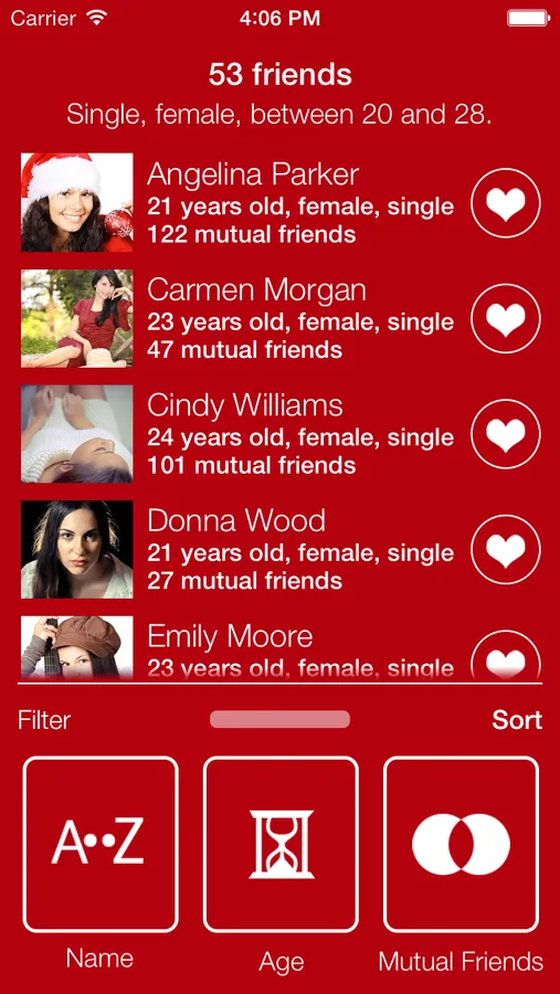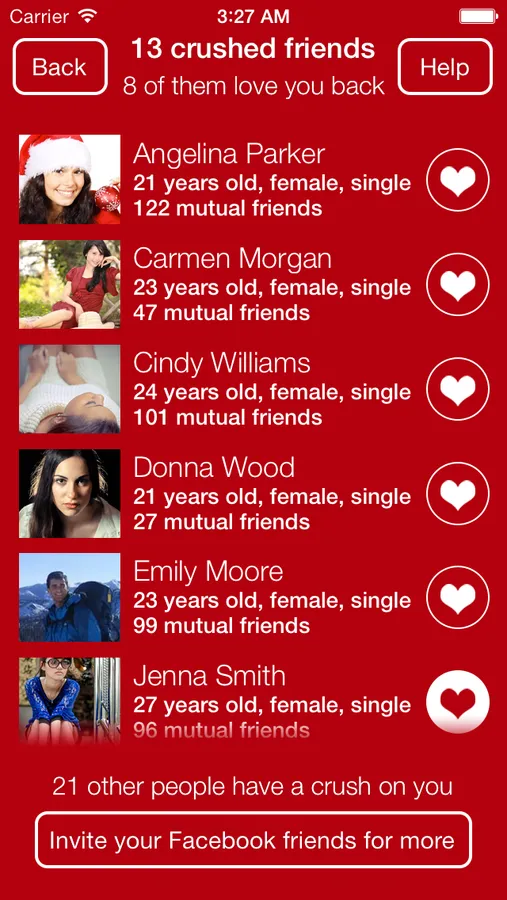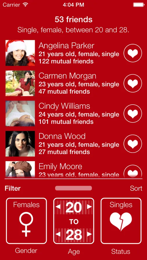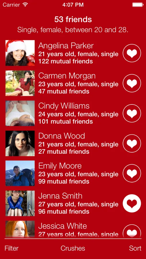 Secretly crush your single Facebook friends! Social Match lists your Facebook friends and you can secretly "crush" your friends. If they also crush you, you'll be matched, otherwise, they will never know that you have a crush on them. You can view your friends' popular photos, photos together, mutual friends and mutual interests, as well as an advice on approaching them. You can filter and sort your friends by name, gender, age, and mutual friend count. Join the fun now.