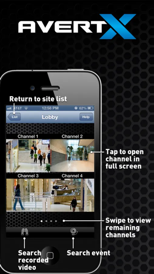 The AvertX GO! mobile app lets you stream live video from your AvertX recorder to your iPhone. Select either single camera or quad view and easily switch cameras with the swipe of your finger.