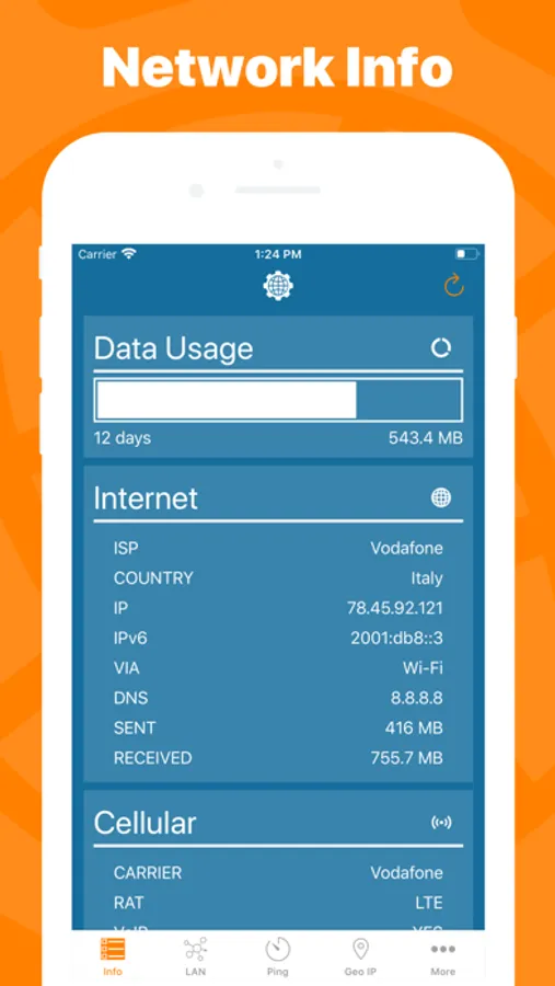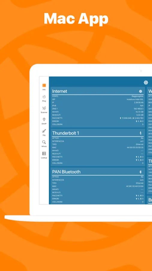 A complete and easy to understand report of your device's network interfaces. In that tab you'll find information like the IP, IPv6, other addresses or the data usage statistics about your Wi-Fi, Internet or Cellular connection (if any).