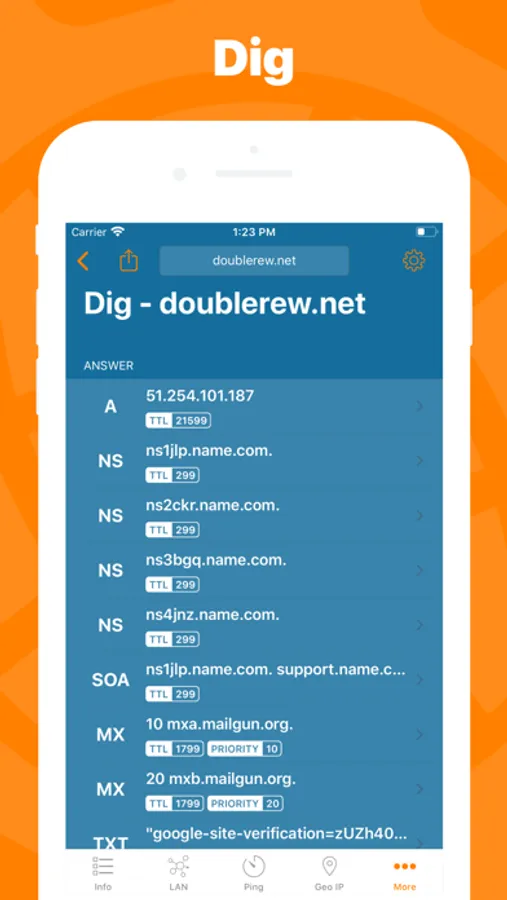 A DNS lookup utility made simple. A list clearly shows the result of your query and the advanced options allow you to customize your request from the type of query to the DNS server.