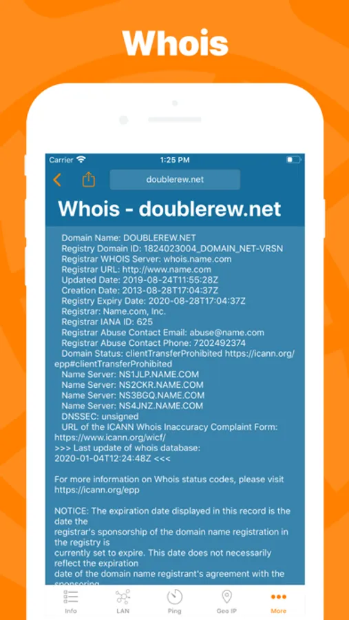 Find any information about a domain name and it's owner e.g. the status, creation date, registrant email and address and many more.