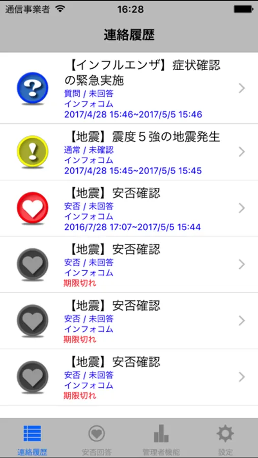 自分宛てに届いた緊急連絡の履歴が確認できます。
