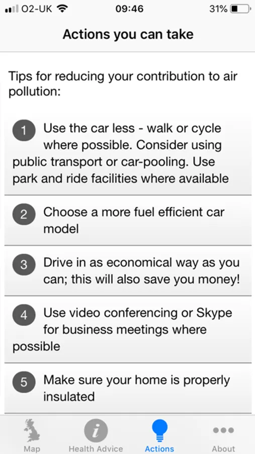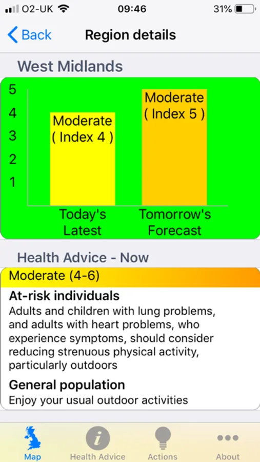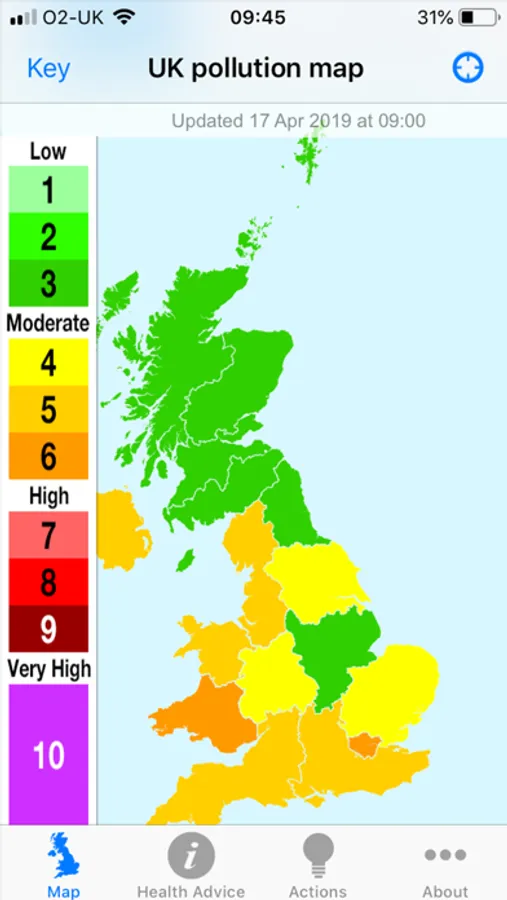 Receive the very latest Air Pollution levels on your phone wherever you are in the UK … worried about the impact of pollution on your health? Our app provides approved health advice, tailored to the latest pollution levels in your region.