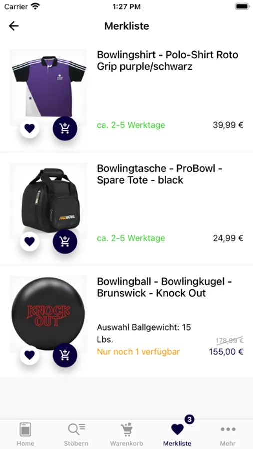 Es lohnt sich übrigens, regelmäßig bei uns vorbeizuschauen: Der Warenbestand unseres Bowling Shop Berlin wird wöchentlich aktualisiert, sodass Sie davon ausgehen können, dass die angebotenen Artikel auch wirklich vorrätig sind und für Sie keine unnötige Wartezeit entsteht. Sollte es wider Erwarten doch einmal zu Engpässen kommen, bitten wir um Ihr Verständnis - und informieren Sie selbstverständlich umgehend.