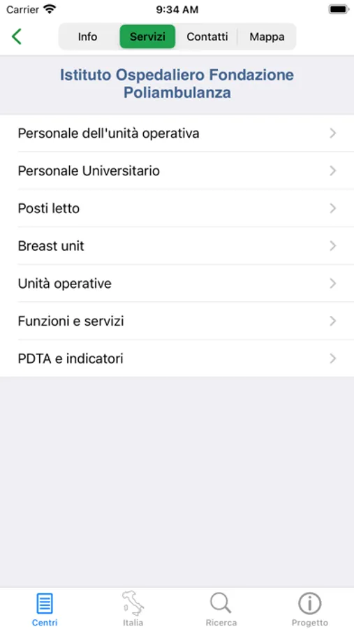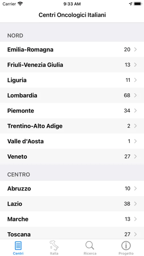 I centri oncologici sono organizzati geograficamente, per regioni e province, in modo che la consultazione sia intuitiva e mirata alle aree territoriali di interesse dell'utente. A tale proposito, è possibile visualizzare una mappa che mostra tutti i centri italiani per facilitare l'individuazione delle strutture presenti in una certa zona.