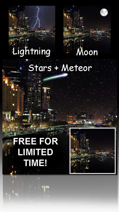 Rainbow, Sunny, Street Light, Night Storm, Stars, Night Fog, Fireworks, Lightning, Moon, Window, Dramatic Sky, UFO, Splash, Tsunami, Snow Flakes, Night Light, Rainy, Snow, Meteor, Heart Cloud, Underwater, Sunset, Color Sunset, Day Fog, Dusty, Autumn, Tulips, Dandelion, Winter, Foggy Glass