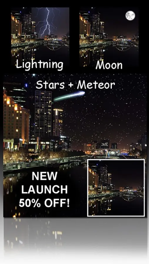 Rainbow, Sunny, Street Light, Night Storm, Stars, Night Fog, Fireworks, Lightning, Moon, Window, Dramatic Sky, UFO, Splash, Tsunami, Snow Flakes, Night Light, Rainy, Snow, Meteor, Heart Cloud, Underwater, Sunset, Color Sunset, Day Fog, Dusty, Autumn, Tulips, Dandelion, Winter, Foggy Glass