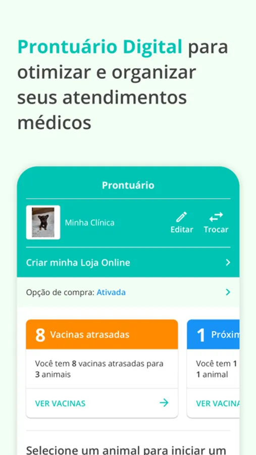 Experimente os benefícios do nosso prontuário eletrônico, gratuito e acesse pelo computador ou pelo celular. Nele você pode ter acesso rápido dos seus pacientes e gerenciar o cadastro de tutores e animais de forma rápida e fácil, anexar vários tipos de exames e documentos e conferir todo o histórico médico de onde estiver, em um só lugar.