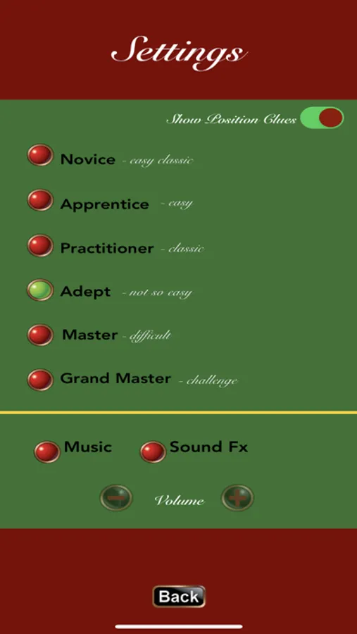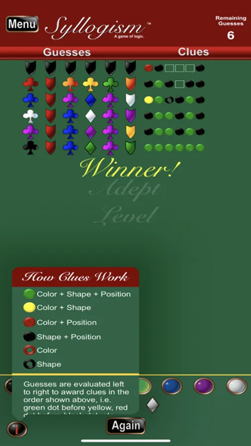 Not just random guesses. Each solution attempt is awarded clues to help uncover the hidden clues. The better you get at reading the clues, the fewer guesses you need to solve the puzzle. The fewer guesses used, the higher the score. 6 levels of difficulty. Pick your favorite play level with or without clue positions. Each level provides unlimited puzzles for hours of challenging game play.