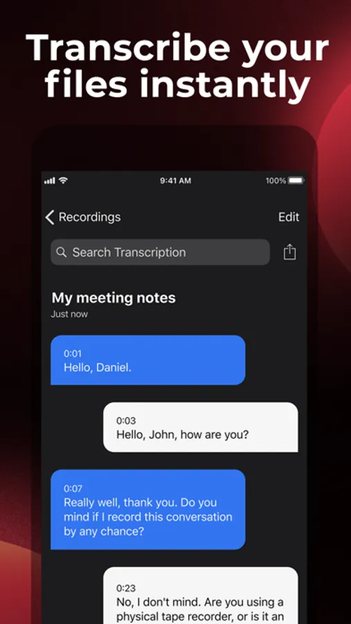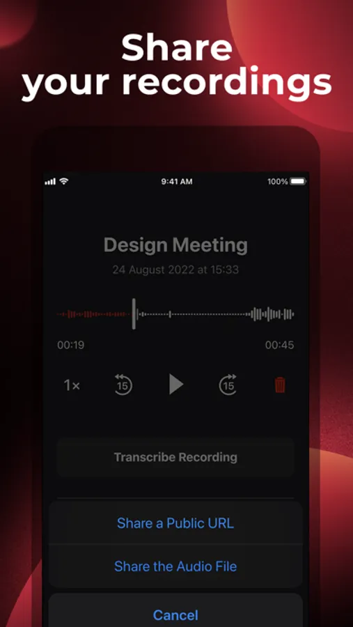 * Share recordings and transcriptions via email, text, and your favorite apps like DropBox, Evernote, and Google Drive, and transfer recordings to new devices