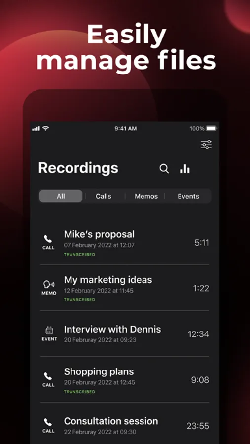 Capture crystal clear recordings, transcribe those recordings with 99% accuracy, and easily download those recordings and transcriptions to your computer. All with a couple of taps in the TapeACall app.