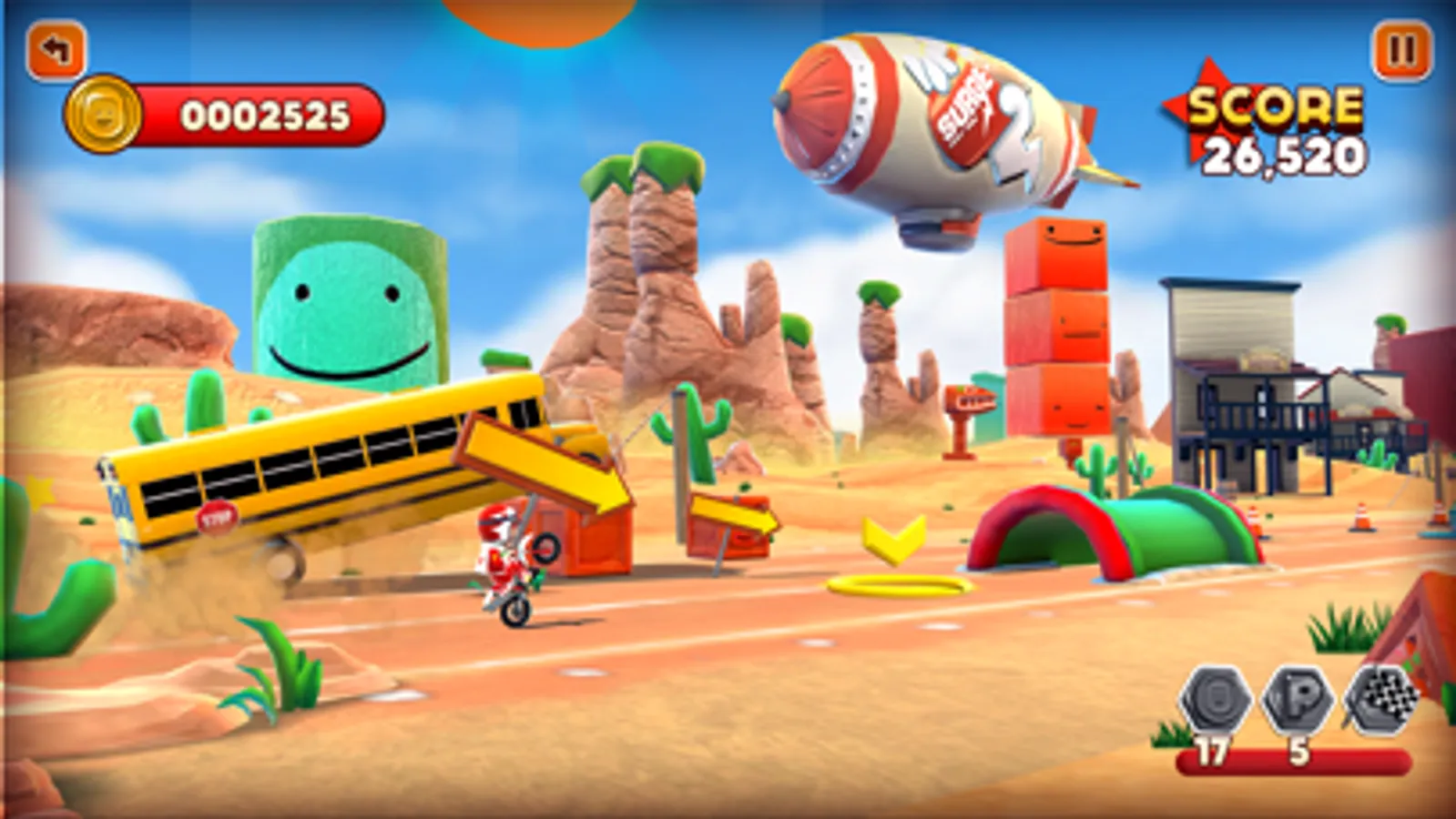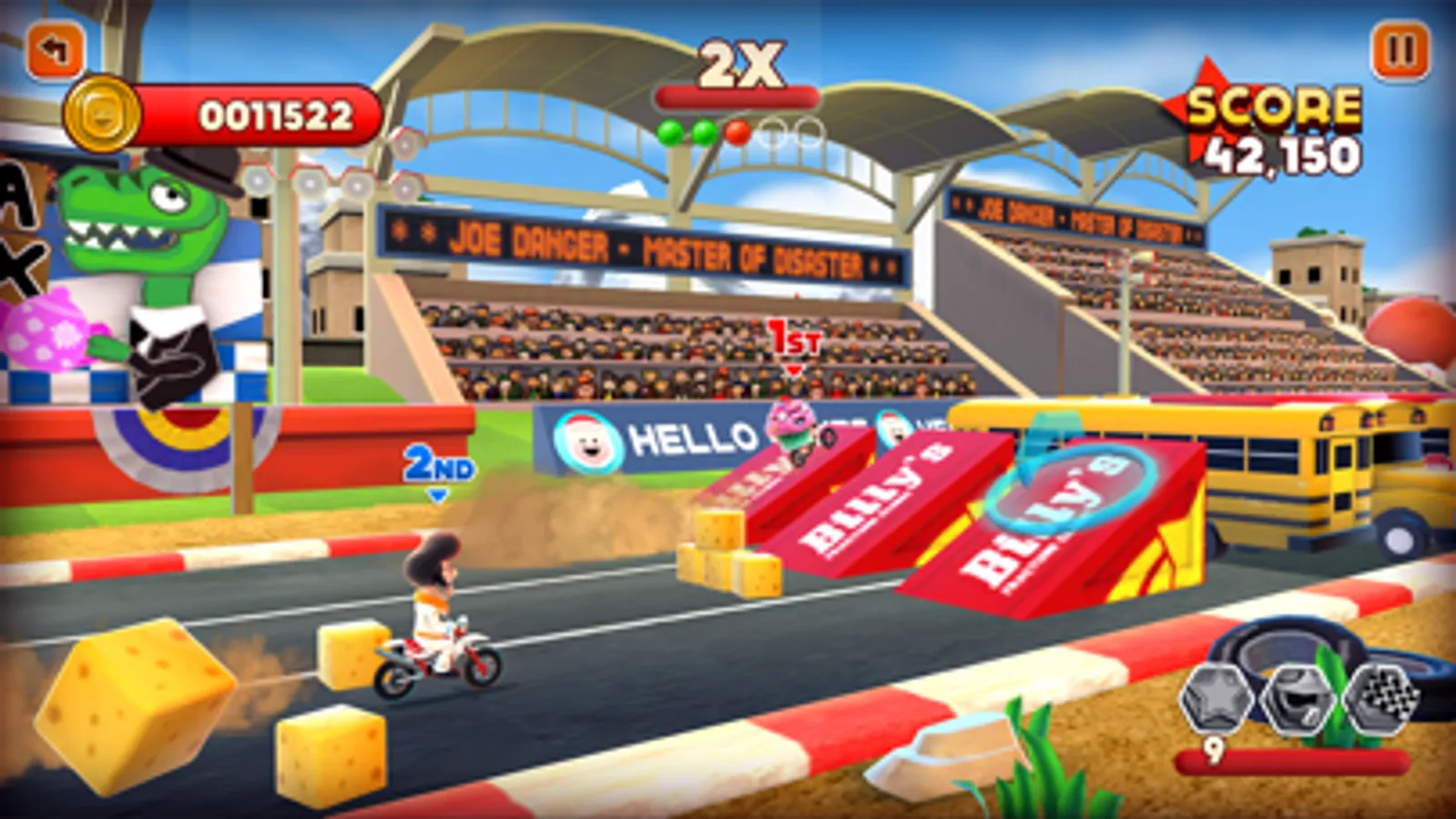 Wear the cape of the World’s Most Determined Stuntman, and take your trusty motorbike on a wild ride from zero to hero! Race, ride and defy death as you jump buses, dodge giant mousetraps, leap tanks full of sharks and reclaim your title of Master of Disaster! Swipe Joe to pop a wheelie, flick obstacles out of the way, tap to jump, hold down to crouch and waggle to fight sharks!