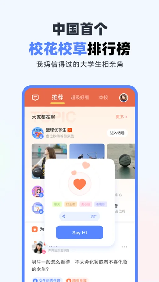 中国首个且唯1的校花校草排行榜,吃瓜本校的校花校草,查看你们专业院系里的同学哪个颜值最高长相排名第几,传小纸条认识新同学,交个P友谈个恋爱,这才是新世代大学生该有的样子,我们尊重每一份骂声也尊重每一份建议,社区不好用我们会努力去整改