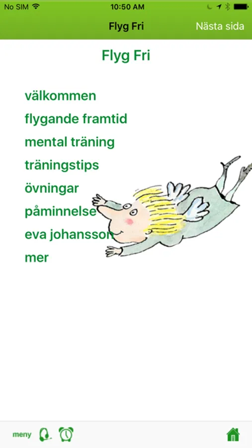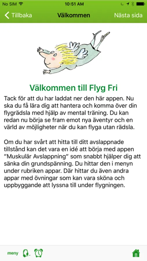 "Tack för en jättebra, pedagogiskt upplagd app! Den gav mig mycket styrka och lugn när jag nyligen skulle trotsa min flygrädsla som jag haft i 15 år. Allt gick fantastiskt bra! Jag tycker att appen ”flyg fri” var ett utmärkt redskap både innan och under själva flygresan. Jag kunde, med hjälp av en av avslappningsövningarna, visualisera hur allt gick till, från att man bestämt sig för att resa, hur allt gick till på flygplatsen och till hur jag skulle uppleva själva flygresan. Tack från en mycket nöjd tjej som nu ser fram emot att flyga till Paris!"