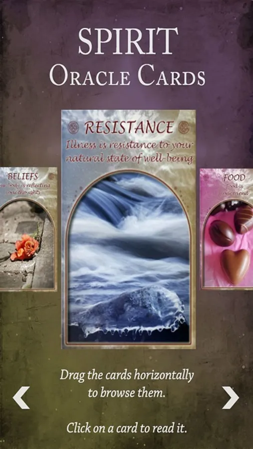 - Explore 3 types of readings: 1 card, 2 cards (relationship) or 3 cards (mind / body / soul)