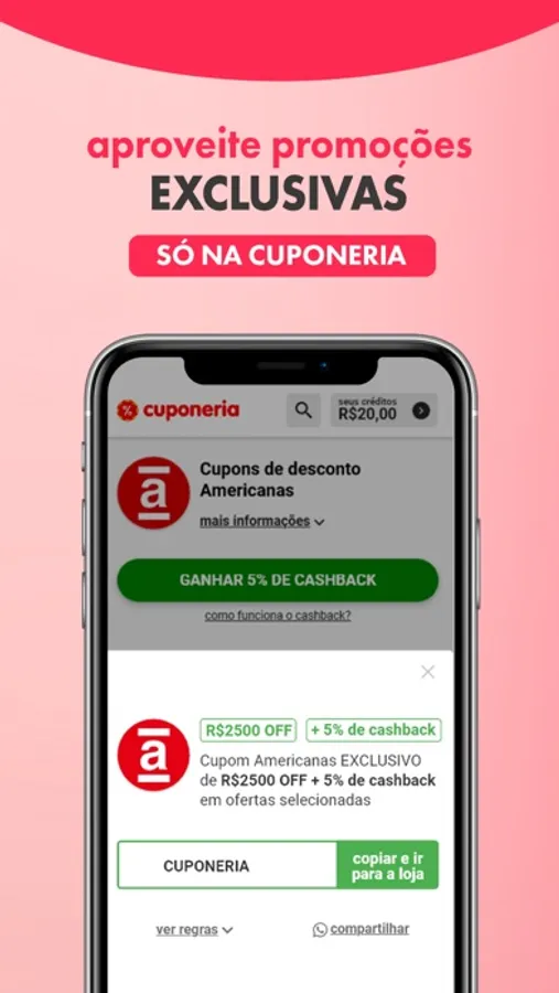 A Cuponeria é o primeiro aplicativo de cupons grátis do Brasil. Com ele, você encontra os melhores cupons de desconto e ganha cashback nas compras em mais de 2.000 lojas parceiras. E o melhor: é totalmente grátis!